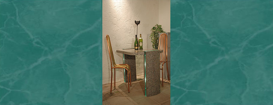 Marthè Verbruggen Reclame-schilderingen/Terrazzo Art & Design is een eenmanszaak waar al ruim dertig jaar buitenreclame ontworpen en gerealiseerd wordt. Dit werk wordt nog vaak handmatig gedaan met de ouderwetse degelijke schildertechniek op auto’s, zonwering, reclameborden, etalageruiten, spandoeken, etc. Ook worden al twintig jaar interieur/kunstobjecten ontworpen en vorm gegeven. Naar eigen idee, maar ook het idee van de klant, hoe buitenissig dan ook, is welkom. De eeuwenoude terrazzotechniek in een nieuw jasje gegoten, vaak gecombineerd met glas en licht. De kunst- en waterobjecten kunnen zowel voor het interieur of als tuindecoratie ontworpen worden. De buitenobjecten worden dan natuurlijk wel van weerbestendige materialen gemaakt, zoals glas, staal, beton, of met polyesterhars gelamineerde glasvezel. De metallic-print foto’s worden machinaal geappliqueerd op een twee millimeter dikke kunststof plaat van 100x150cm. met een verstevigings frame aan de achterkant dat ook als afstandhouder op de wand dienst doet. De foto’s zijn uitvergrotingen van allerdaagse dingen.Uitvergroot in een andere context geplaatst geven ze een eigentijdse bijzondere uitstraling in ieder interieur. U bent van harte welkom in Oirsbeek. ( liefst op afspraak )